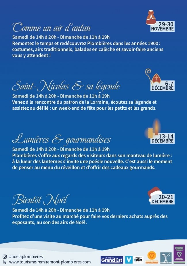 Le « Marché de Noël d'antan » est sans aucun doute l'un des plus authentiques des marchés de Noël des Vosges ! Tout au long de l'année, les bénévoles se mobilisent pour créer les décors qui subliment l'élégante Plombières-les-Bains.