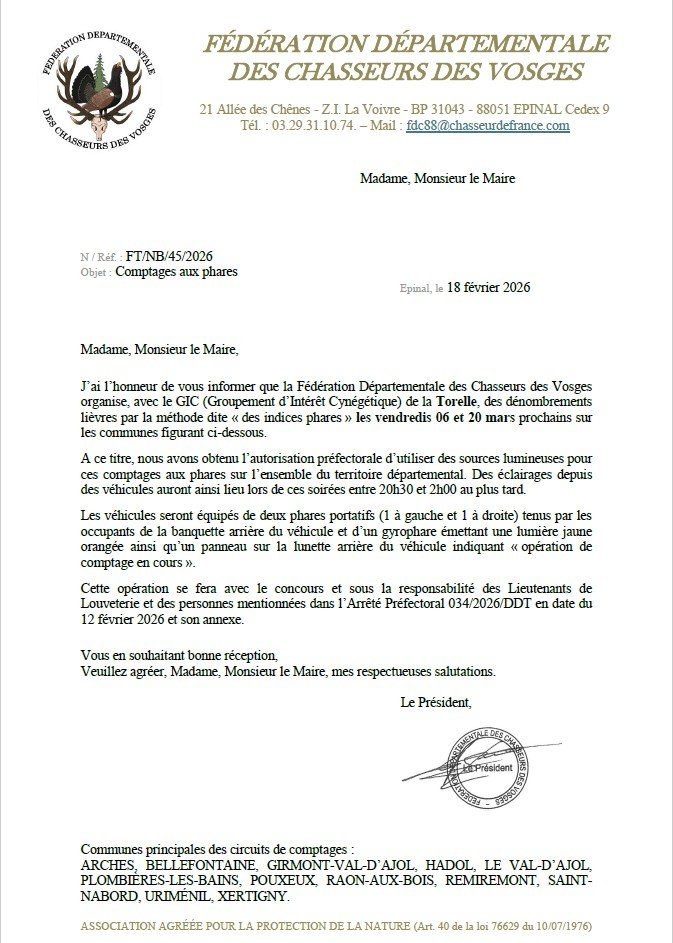 La Fédération Départementale des Chasseurs des Vosges informe les habitants que des opérations de comptages nocturnes de lièvres auront lieu sur la commune de Plombières-les-Bains en mars (ou avril). Ces sorties sont réalisées dans le cadre du suivi de la faune sauvage, afin de mieux connaître la présence du lièvre et d'adapter la gestion du territoire.
